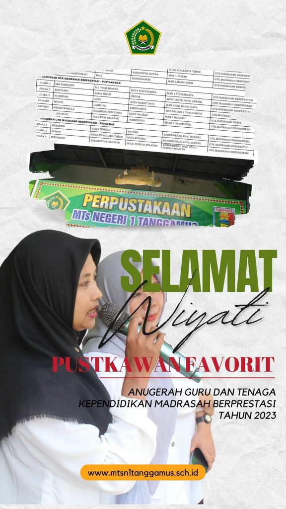 Tanggamus, MTsN 1 (Humas) – Wiyati dan Tim Pustakawan MTsN 1 Tanggamus sukses meraih prestasi gemilang dengan memenangkan Anugerah Guru dan Tenaga Kependidikan (GTK) Madrasah Juara Favorit dalam kategori Pustakawan. Penghargaan ini diumumkan melalui Surat Keputusan Pejabat Pembuat Komitmen Direktorat Guru dan Tenaga Kependidikan Madrasah, Direktorat Jenderal Pendidikan Islam Kementerian Agama Republik Indonesia, Nomor 6544 Tahun 2023. Kamis, 7/12/2023.